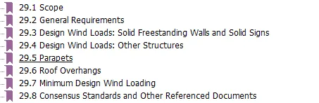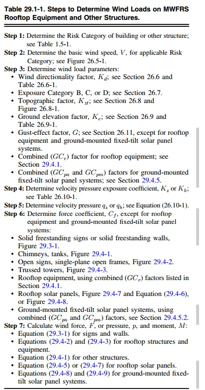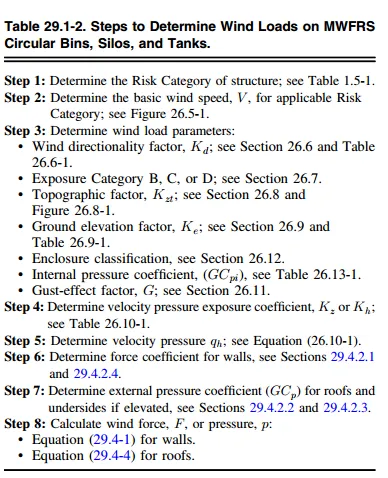 29章主要是针对建筑附属物和其他结构的风荷载计算规定,我理解就是构筑物或者一些屋顶附属物,如建筑铭牌啊、屋面光伏系统、屋顶设备基础、独立墙体、烟囱、储罐、筒仓这些的风荷载计算规定。ASCE 风荷载的每个章节都给出了完整的计算流程(table 29.1-1~2),table 29.1-1用来计算屋面设备基础和附属结构,table 29.1-2用来计算圆形筒料仓、储罐。我用的不太多,我不做展开,有计算需求的,大家可以直接搜索29章,针对不同的建筑功能,有不同的小节。