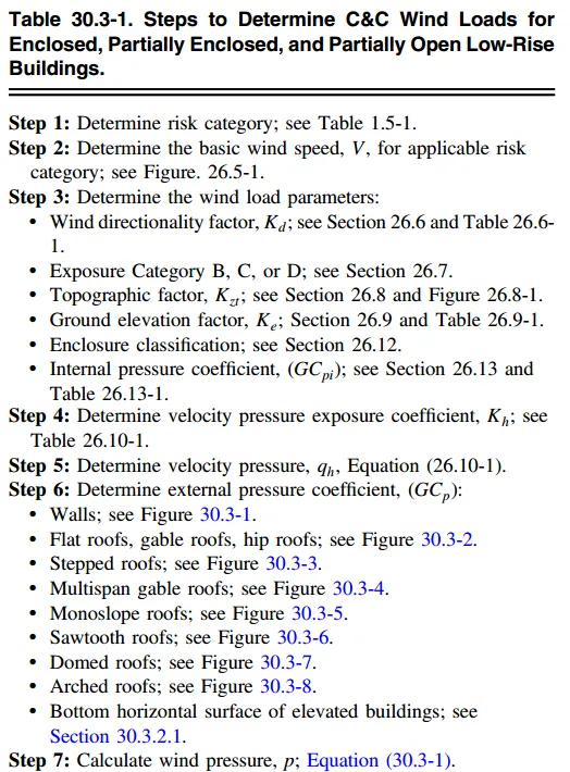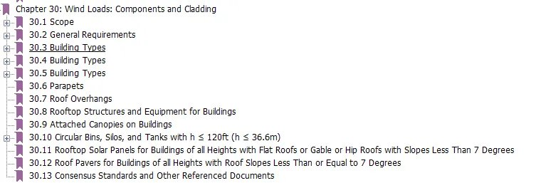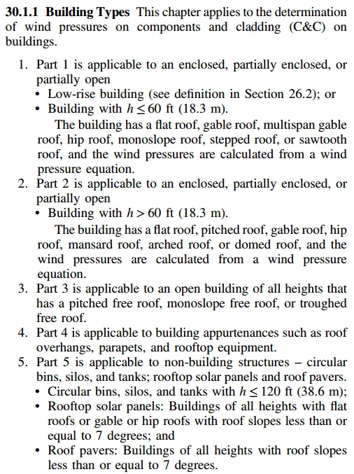 30章就比较重要了,前面都是针对主要抗风系统的计算方法,30章就是如何计算围护结构(C&C),下图是30章节的目录,其中30.3~30.5就是不同的building type