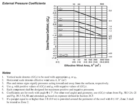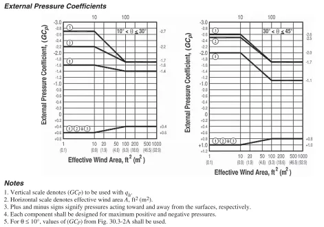 其中qh取平均高度,与主结构屋面一致,不随着悬挑深度变化,与女儿墙计算公式的区别就在于这个高度取值不同。GCp同样查表格,其中不超过7°的双坡屋面查figure30.3-2A的overhand曲线,大于7°的和非双坡屋面不同的屋面形式和坡度系数查表如下所示: