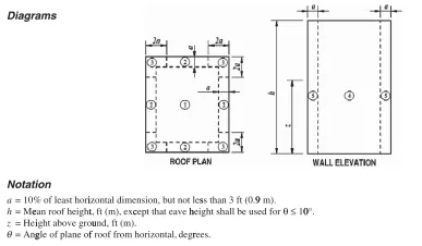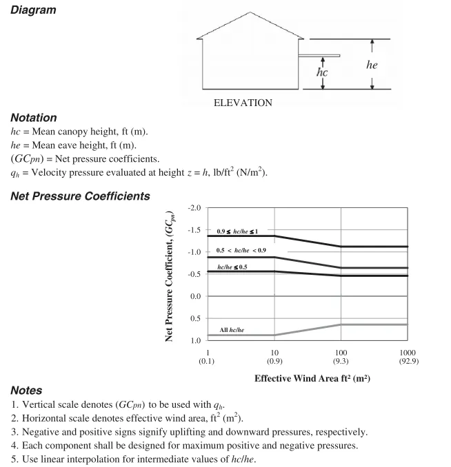 屋檐挑檐即屋顶延伸出墙体的水平挑出部分,下面没有支撑,女儿墙是竖向的,overhang是水平受风荷载,适用于所有高度的封闭、部分封闭和部分开发建筑,风压计算公式是: