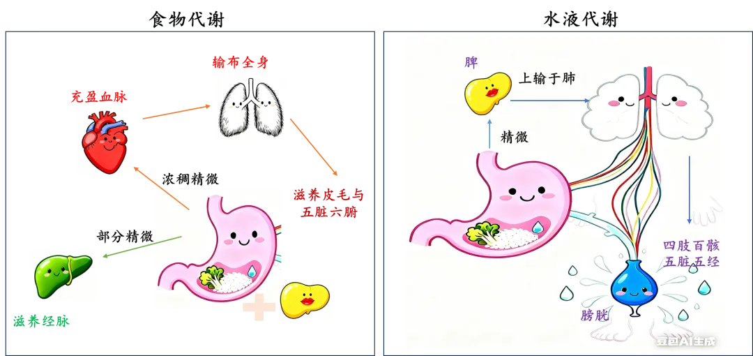 • 食物代谢路线:①食物→胃(部分精微)→肝→养筋 ;②食物→胃(可生成气血的精微)→心→充养血脉→肺(血脉精气)→输布全身→滋养皮毛与五脏六腑