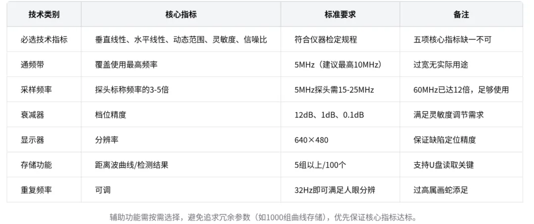 辅助功能:辅助功能非强制指标,如通频带包含目前使用的最高频率 5 MHz 即可,最高到 10 MHz 足够;采样频率为探头标称频率的 3 - 5 倍;重复频率要求可调;衰减器有 12 dB、1 dB、0.1 dB 即可;显示器分辨率最好为 640×480;存储距离波谷曲线 5 组以上、检测结果 100 个,能用 U 盘读取结果。