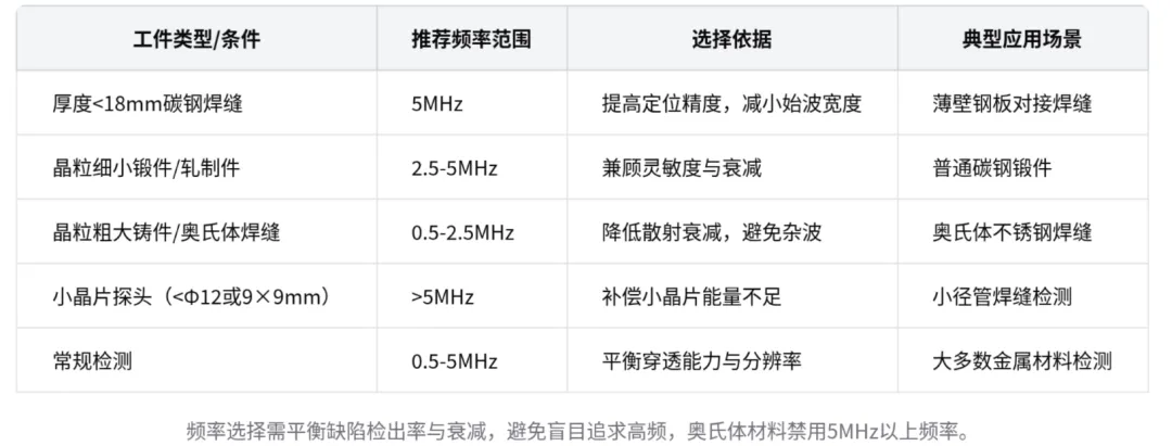 - 晶粒粗大(铸件、奥氏体焊缝):选较低频率(0.5-2.5MHz)。