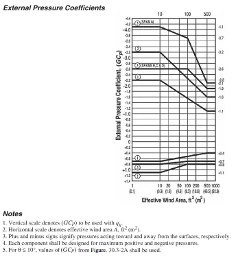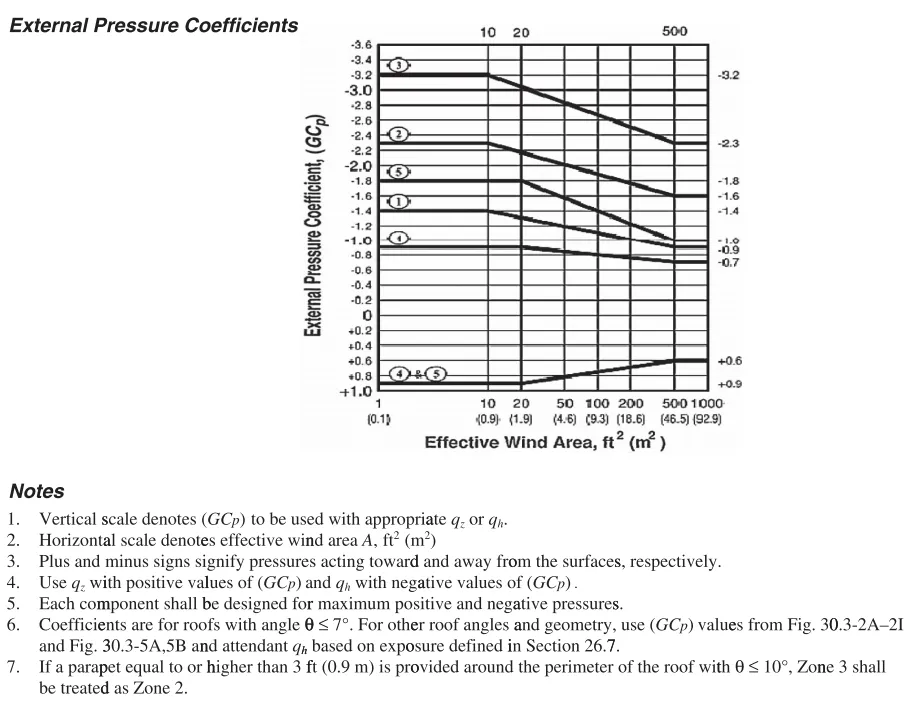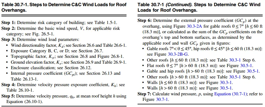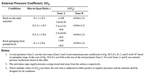 其中qh取平均高度,与主结构屋面一致,不随着悬挑深度变化,与女儿墙计算公式的区别就在于这个高度取值不同。GCp同样查表格,其中不超过7°的双坡屋面查figure30.3-2A的overhand曲线,大于7°的和非双坡屋面不同的屋面形式和坡度系数查表如下所示: