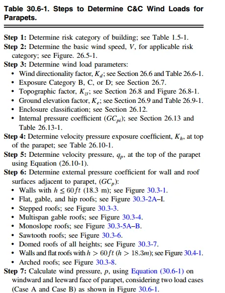 | 1、判断风险类别; 2、查表确定基本风速; 3、确定风荷载计算参数(都在26章); 4、通过高度h、暴露等级查表26.10-1确定Kh; 5、计算风压(公式26.10-1); 6、计算外压系数GCp(不同的屋面形式查不同的表); 7、计算风压,公式30.3-1; |