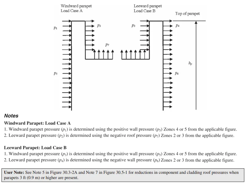 →简单来说,就是case A内侧按屋顶边缘取值,case B内侧按墙体背风取值,通常计算下来是Case A控制,即外侧压力和内侧屋顶吸力是控制工况。女儿墙在进行风荷载计算时,如果满足note 5(figure 30.3-2A)和note7(figure 30.5-1)可以进行压力折减。
