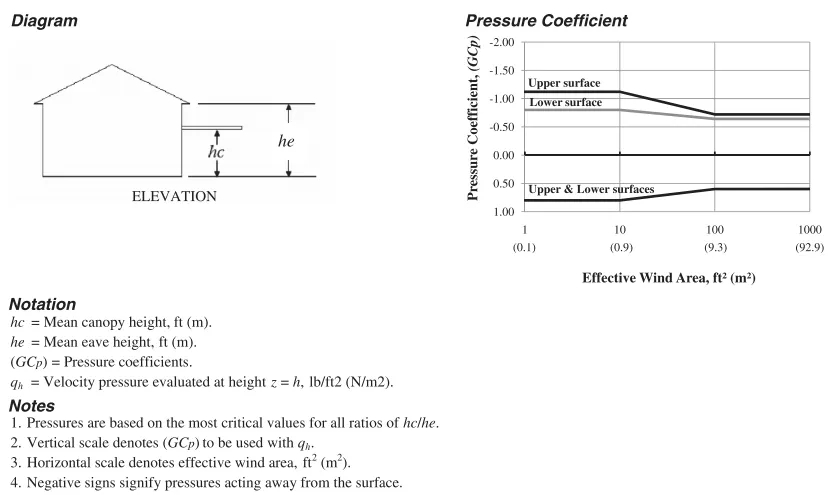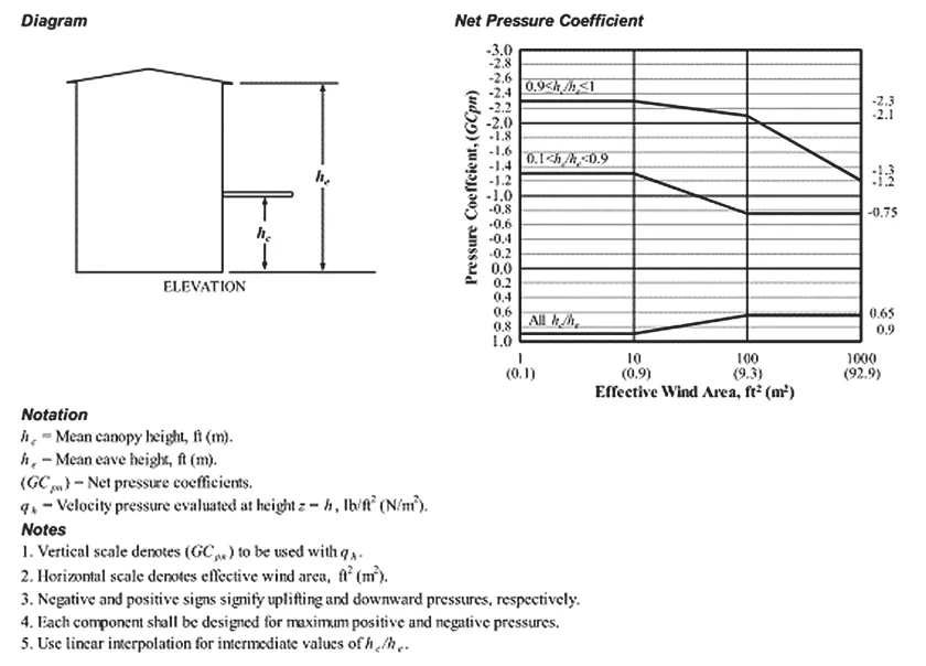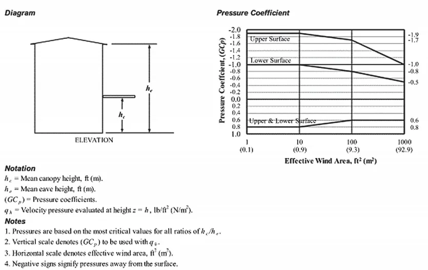 屋檐挑檐即屋顶延伸出墙体的水平挑出部分,下面没有支撑,女儿墙是竖向的,overhang是水平受风荷载,适用于所有高度的封闭、部分封闭和部分开发建筑,风压计算公式是: