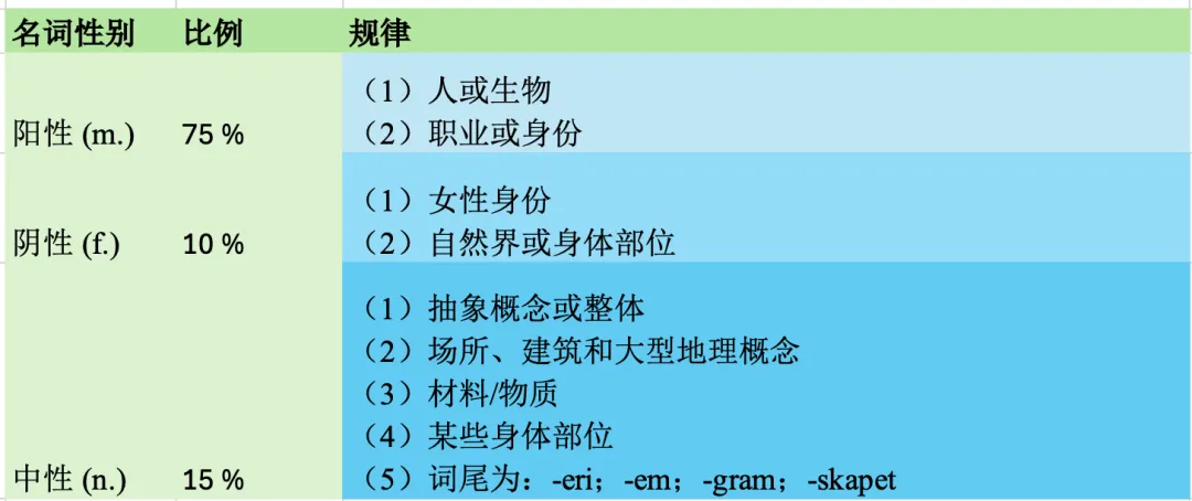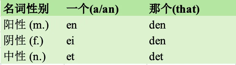 在学习挪威语的过程中,你会发现en, ei, et, den, det 这几个单词都以表示1个,很容易混淆不清,其实:en, ei, et 这三个以e开头的单词都是相当于英文中的a/an, 泛指的时候用den, det这两个以d开头的单词都是相当于英文中的that, 特指的时候用(通常指已经提到过的,或者离你有点距离的)第一步:确认是泛指的情景还是特指的情景(表示1个还是那个?)挪威语中的名词分为阳性,阴性,中性三种,大多数名词都属于阳性名词,如何区分名词的性质呢?其实并没有绝对的可成文的规律。好消息:所有阴性名词可以当成阳性名词来使用,所以其实我们只需要区分中性名词和非中性名词即可,以下我来总结一下常见的几种中性名词(1)抽象概念或整体,如: