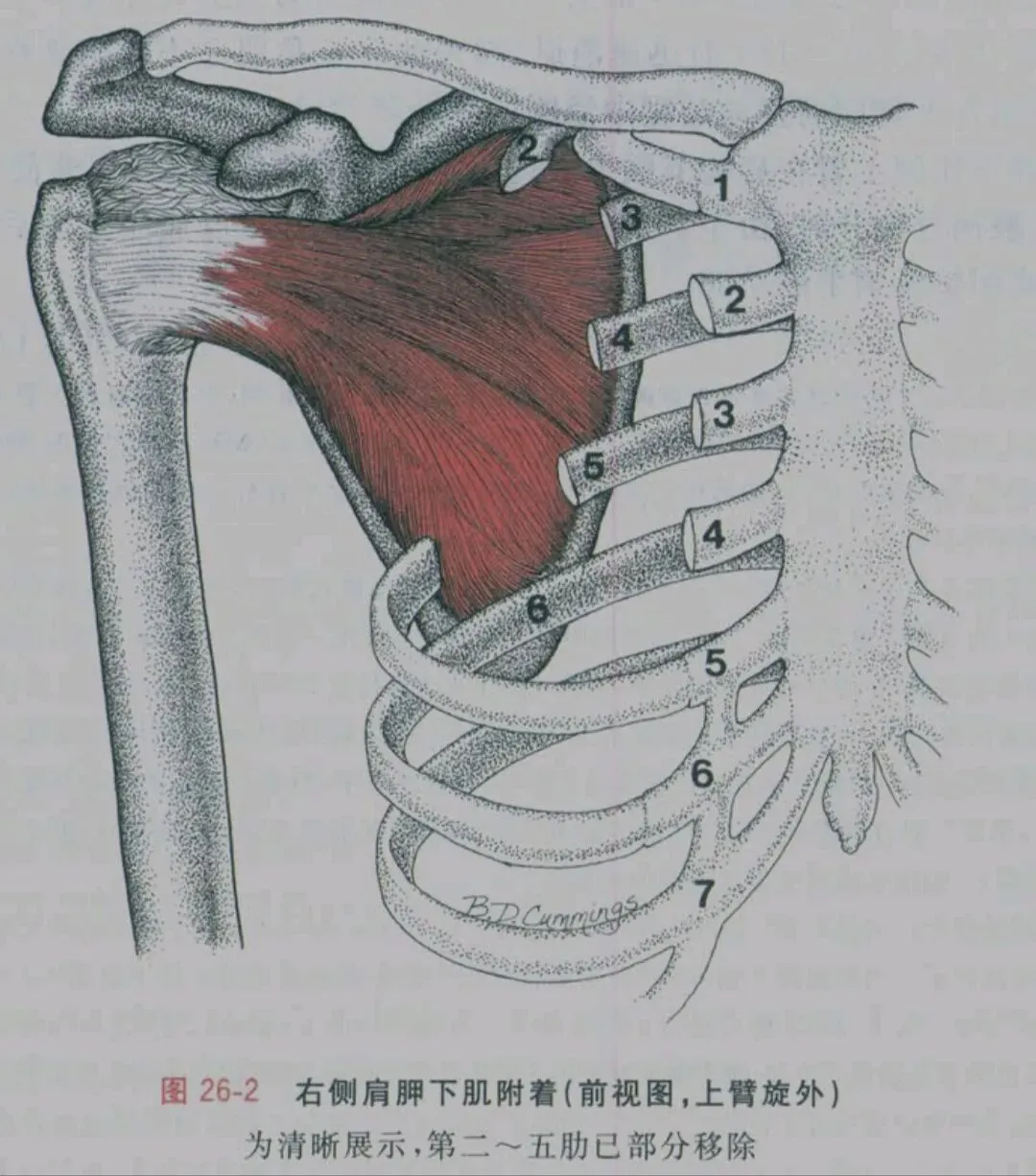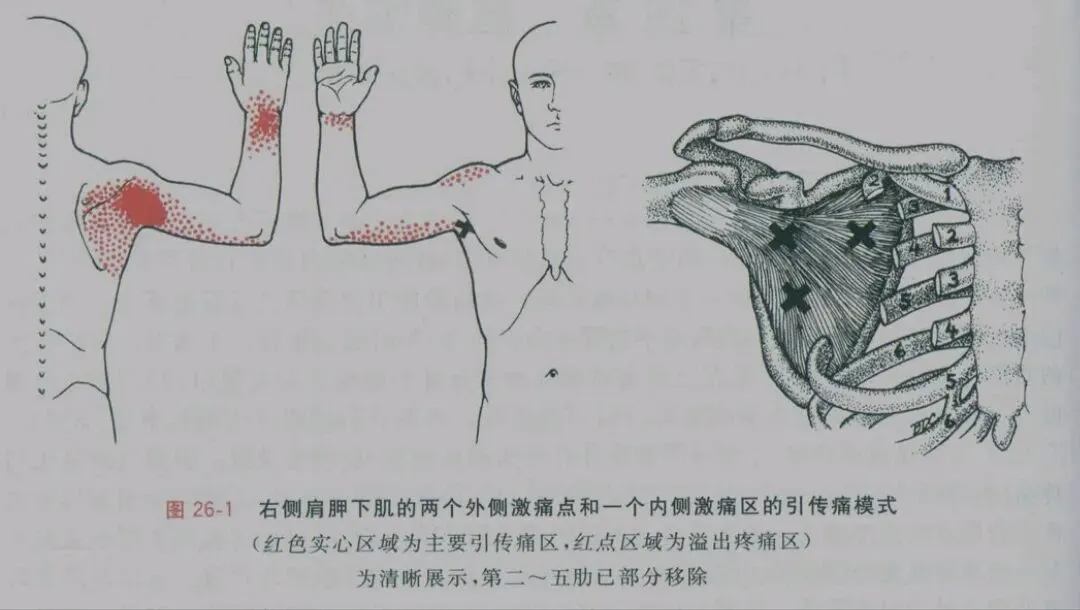 肩胛下肌受累早期,患者手臂能向上、向前伸,但不能向后伸到与肩同高的位置(像投手准备投球的姿势)。随着激痛点活动逐渐加强,上臂在肩关节外展严重受限到45度甚至更小。这时患者会主诉静止和运动时疼痛,且手不能够到对侧腋窝。患者常被告知他们患有“冻结肩[frozen shoulder]”、粘连性关节囊炎[adhesive capsulitis]或“投手臂[pitcher's arm]”。如果提到腕部,患者常说腕部酸痛,且疼痛分布在一带状区域,特别是手背上。因为腕部存在压痛,患者可能会把手表戴到另一只手上。