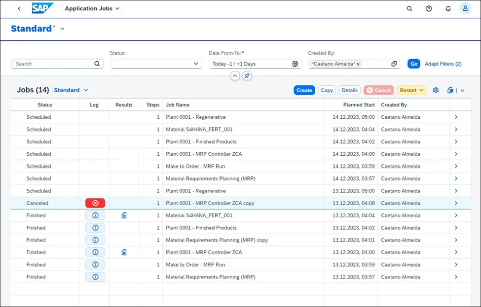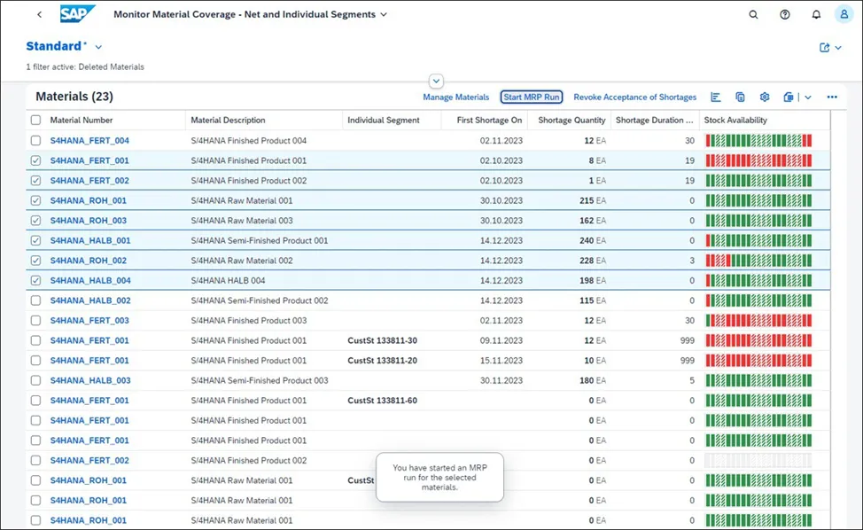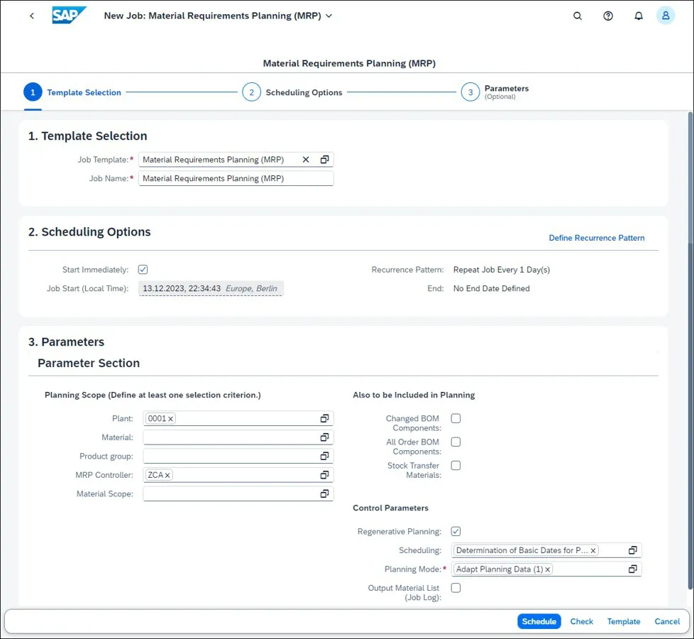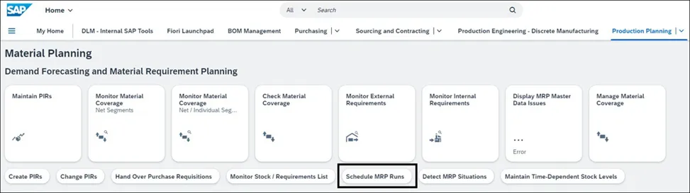 实施SAP S/4 HANA的一个显著的好处是,其新的SAP Fiori用户界面的可用性,该界面提供了使用SAP Fiori运行MRP的附加选项。在 SAP Fiori启动面板中,可以计划MRP Live运行,并可以使用计划MRP运行app控制以前的计划运行,如下图中突出显示的。首次进入此应用程序时,将看到已计划、已完成或失败的 MRP Live 运行的列表。通过单击最后一列中的箭头(见下图),可以看到作业变式的详细信息,包括MRP控制参数和选择标准。在右上角,菜单栏包含用于创建新的MRP Live 执行计划、复制现有计划、取消仍在处理中的执行或重新启动失败的MRP执行的按钮。对于已完成和失败的MRP Live 执行,将在日志列中看到一个图标,其中表示作业失败或已取消,表示作业成功。单击该图标将打开MRP实时执行的详细日志,如下图所示。此屏幕显示每次执行的消息类型、描述和时间戳。在创建 MRP计划期间选择Output Material List (Job Log) 输出物料列表(作业日志)选项时,该图标将出现在Results 结果 列中,如果单击此图标,将被重定向到MRP池,将在其中看到MRP计划的物料列表,类似于下图中所示的列表。要安排新的MRP实时执行,您需要单击初始屏幕右上角的创建按钮,如下图所示。还可以选择使用相同的控制参数和选择标准,通过复制现有计划来创建新作业。用户可以创建作业模板,以便在需要安排许多不同的MRP运行时通过单击右下角的模板按钮来帮助用户(参见下图)。例如,如果要为同一公司下的不同工厂计划单独的计划运行,则可以使用默认控制参数创建作业模板,并在创建作业时更改工厂。使用这个SAP Fiori app创建新作业时,可用的选择字段和控制参数与SAP GUI事务码MD01N中可用的字段和控制参数相同,如上图所示。可以选中Start Immediately 立即启动 标志以立即触发MRP运行,或选择日期和时间以计划将来的执行。在 Schedule MRP Runs 计划MRP运行 app中,还可以通过选择 DefineRecurrence Pattern 定义重复模式 选项并在弹出窗口中选择MRP定期执行的重复来安排定期后台执行,如下图所示。计划MRP运行app并不是唯一可用于从SAP Fiori启动面板触发MRP运行的选项。在 MRP主控室中,可以通过单击 Start MRP Run 开始MRP运行 按钮从多个MRP apps 触发MRP运行。下图显示了针对在 Monitor Material Coverage 监控材料覆盖率 app 中选择的一组材料触发的MRP Live。当从MRP主控室app触发MRP运行时,将执行单物料/单级计划MRP。在 SAP S/4 HANA 的早期版本中,应在此计划运行中对以下 MRP 控制参数进行硬编码:SAP Note 2482315提供了可实施的修改,允许为计划运行选择不同的参数。从SAP S/4 HANA 2020 开始,MRP运行参数不再硬编码,无需进行此修改。用户可以在用户配置文件中更改MRP运行参数,访问App Settings 应用程序设置 菜单选项。你若喜欢,点个❤️谢先👇