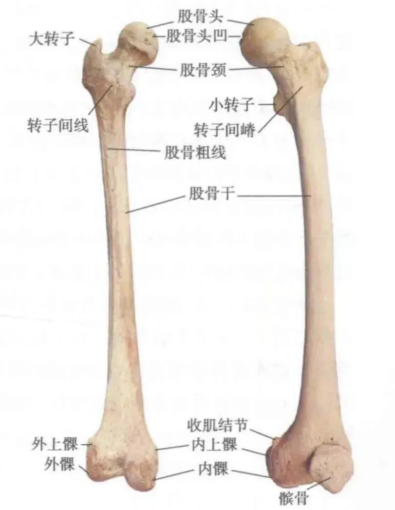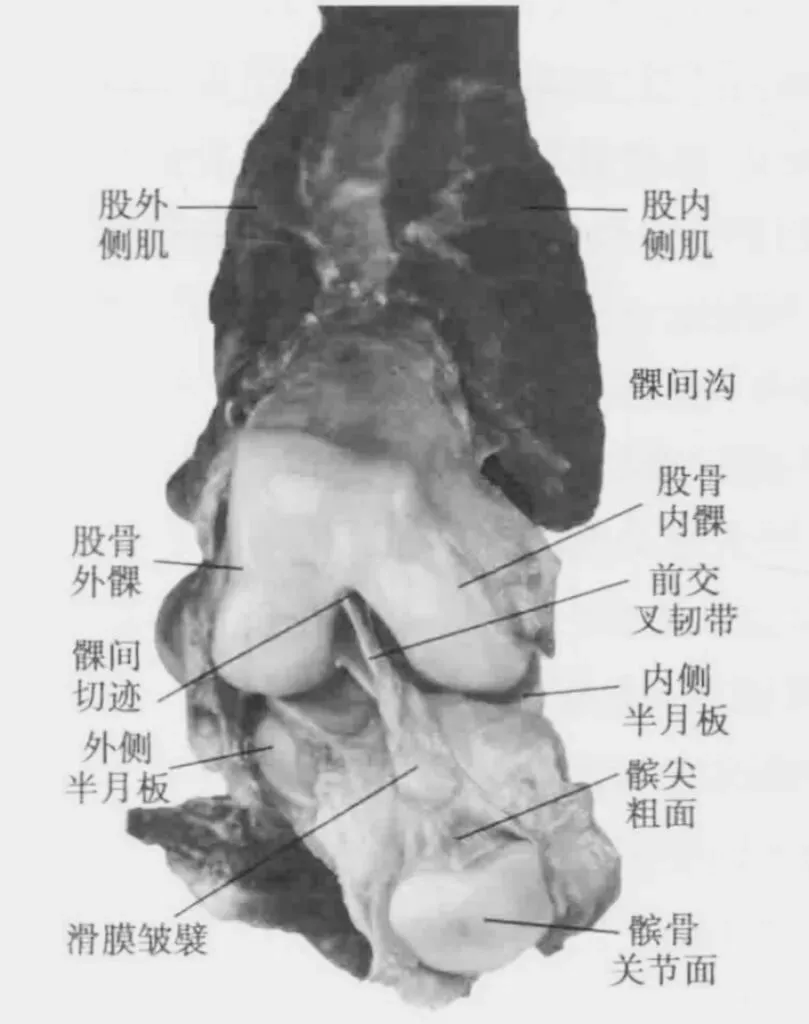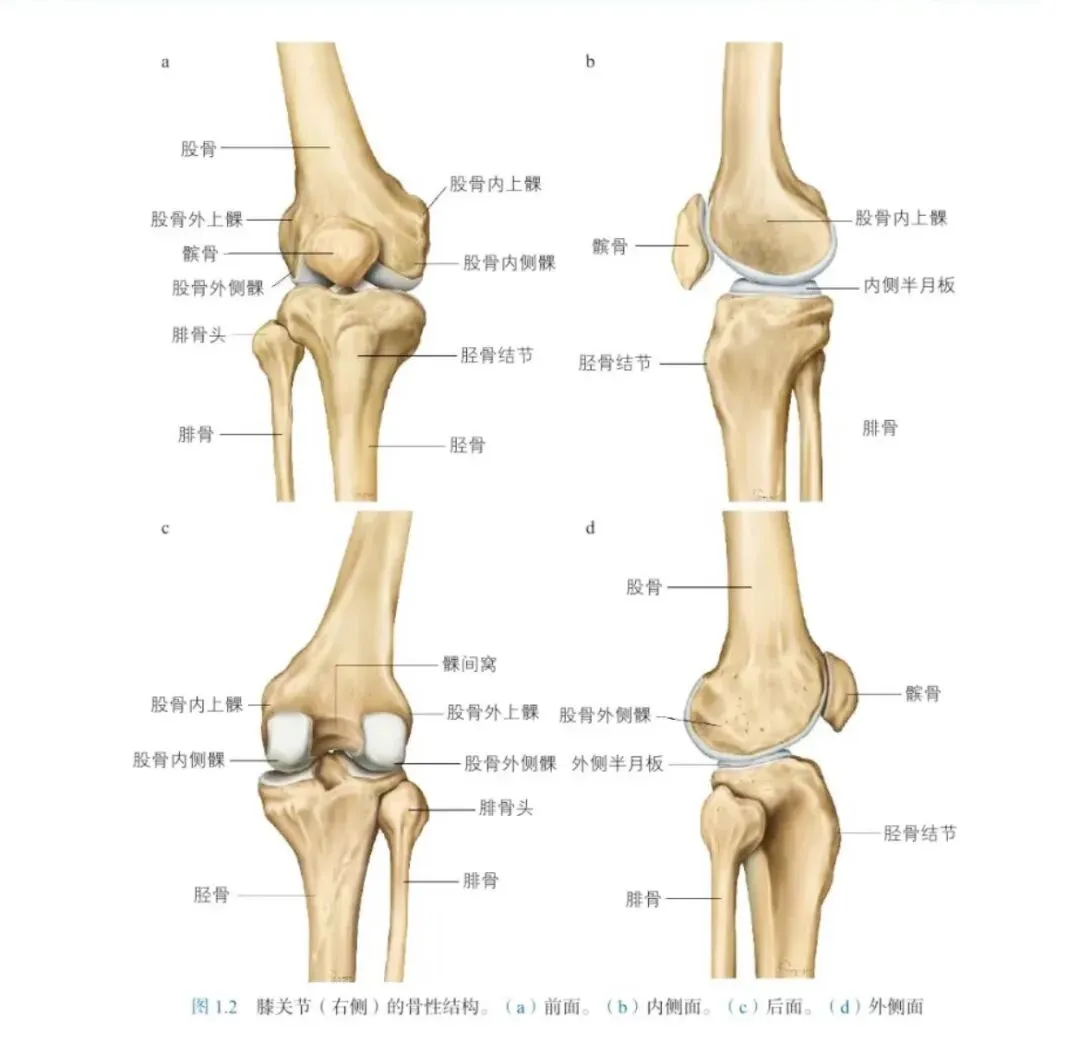 股骨为一中段稍向前弯的长骨,近端承接骨盆的分力。股骨远端有两个明显的骨性凸起,分别为股骨内侧髁和外侧髁,内、外侧髁之间的前侧为髁间沟,是髌骨滑动的轨道;后侧为髁间切迹,提供交叉韧带通过的通道。当髁间切迹的空间较小时,会增加交叉韧带受损的可能性。内、外侧髁的上方有小的骨性凸起,分别为内、外上髁,为副韧带牵拉所致。股骨远端与胫骨构成胫股关节。
