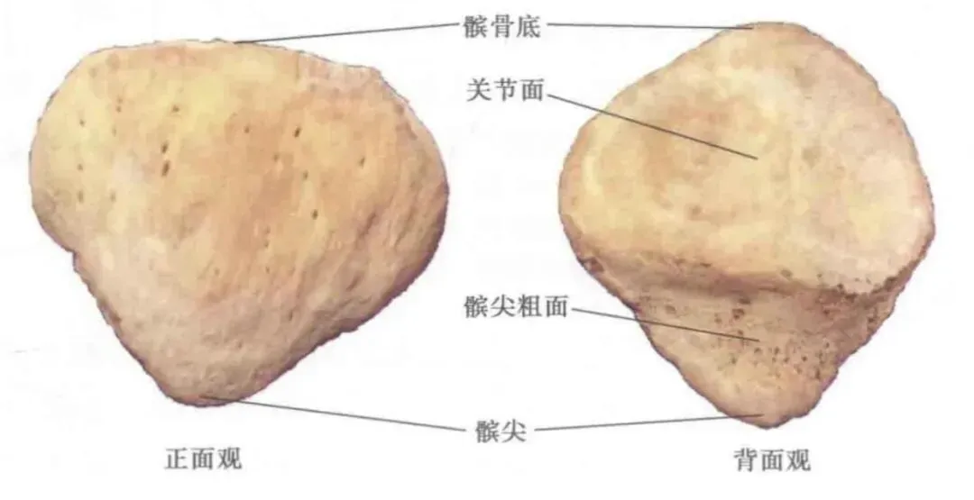 髌骨:为人体中最大的籽骨,上方为基部,连于股四头肌;下方为髌尖,是髌韧带附着处。髌骨在股四头肌与股骨间充当间隔角色,增加了膝关节伸直肌群的内在力臂。在髌尖内后侧有一粗糙面,为髌下脂肪垫附着处。