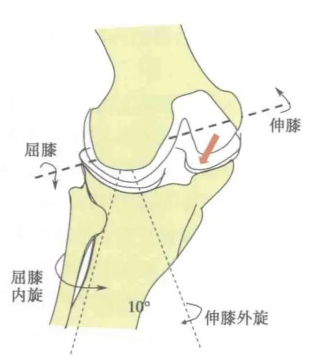 不过,这种空间结构的改变使膝关节处于强直状态,如果完全伸直的膝关节变为屈曲,需要胫骨相对于股骨内旋转,使胫股关节面达到最小接触,恢复膝关节的运动状态。有学者称此变化为膝关节的解锁过程。