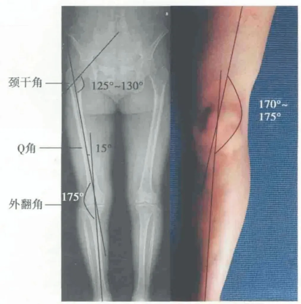 腓骨:虽然没有直接参与膝关节的构成,但对胫骨平台外侧的支撑起到了至关重要的作用。由于股骨颈干角的出现,膝关节在正常状态下需要轻度外翻来完成下肢力学传递的稳定性,膝关节外翻角度为170°~175°。胫骨平台外侧受力增加,胫腓近端关节的依附承托就表现得非常明显。