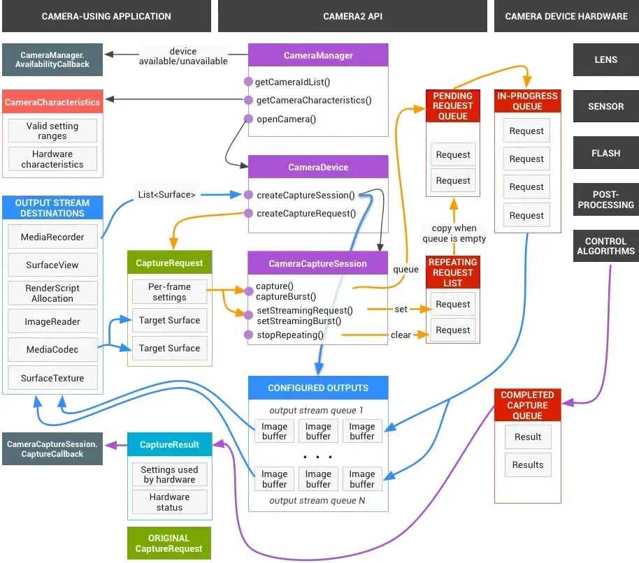 Camera API2中CameraManager用于openCamera、CameraDevice用于创建CameraCaptureSession(配流)。