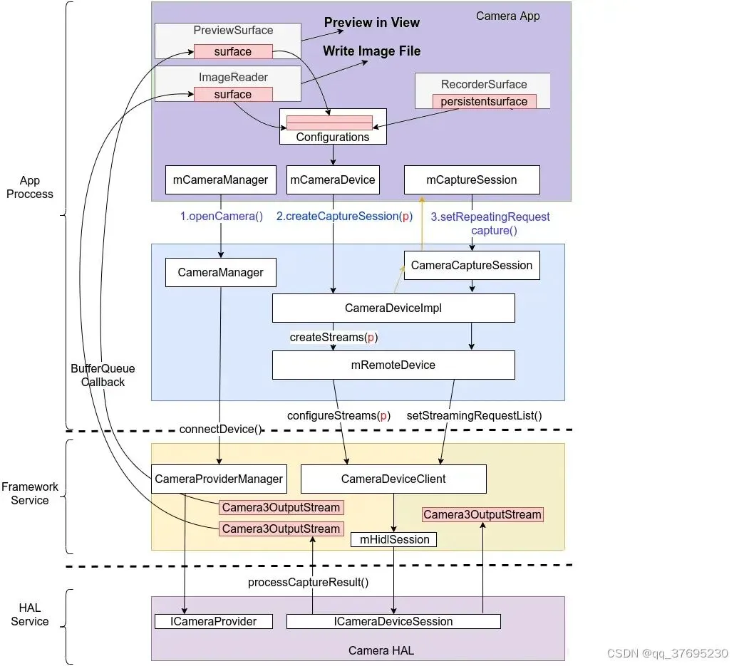 - CreateCaptureSession简要流程:CameraDevice.CreateCaptureSession -> CameraDeviceImpl.createStreams -> CameraDeviceClient.mHidlSession.configureStreams -> Camera hal configureStreams。