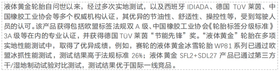赛轮自主研发的液体黄金轮胎成功解决了“滚动阻力、抗湿滑、耐磨性”三大性能难以同时优化的“魔鬼三角”问题,综合性能已接近或持平国际一线。和米其林相比,也并不逊色多少。赛轮的液体黄金轮胎是靠材料来突破(世界首创的化学炼胶技术),米其林靠的是调校与配方,主打静音舒适、高速稳定。液体黄金在节能、耐磨、性价比全面领先;米其林在舒适、静音、操控、品牌与高端体验上占优。