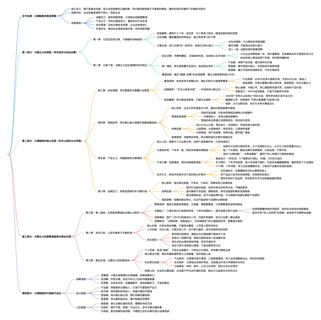 最后,附上在关于钟老板的书籍《以慢制胜》的核心内容思维导图,真的觉得这是位非常非常厉害的企业家,堪称大师。我们总说新一代的 80、90后企业家非常先进,但正好这两天在一个群里看到说:老段、任正非、钟睒睒、曹德旺等这些凤毛麟角的老一辈企业家(我了解到的还比较少,抱歉不能一一列举),可能远远超越了时代...