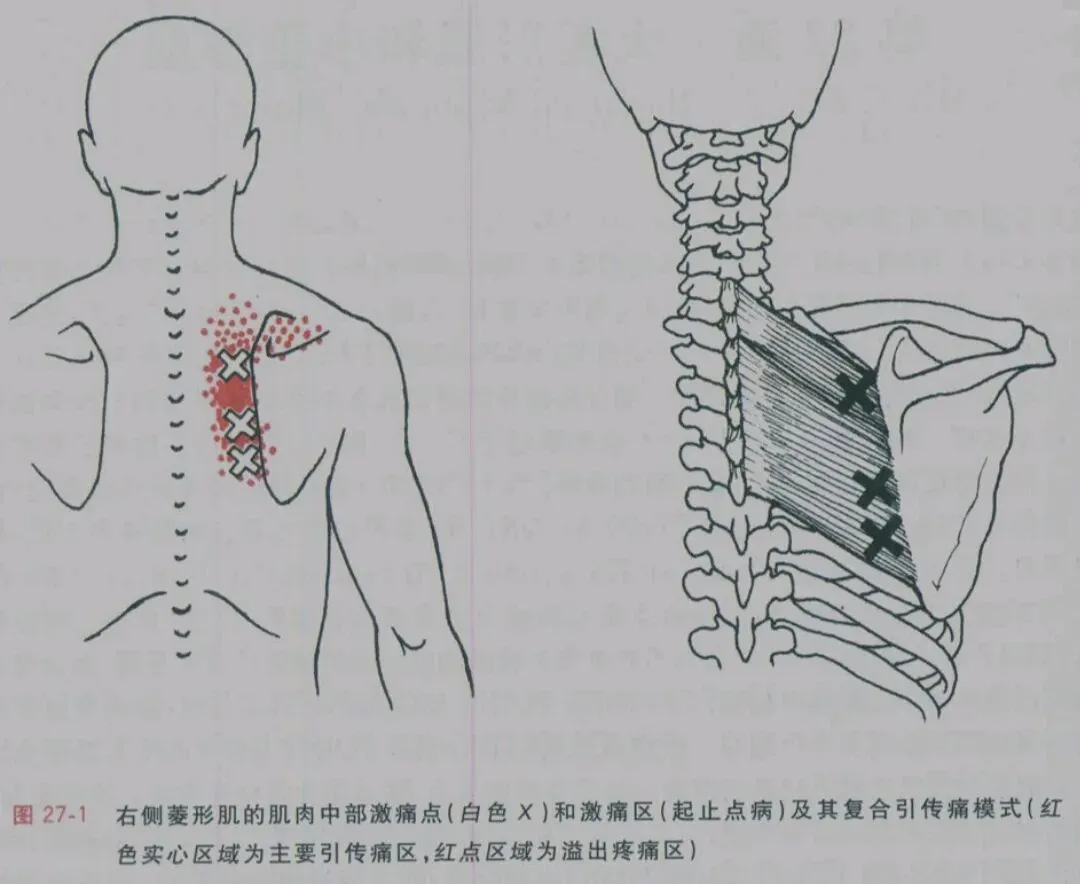 菱形肌激痛点引传痛集中在肩胛骨和椎旁肌肉之间,沿肩胛骨脊椎缘,并可能向上蔓延到肩胛骨的冈上区(图 27-1)。