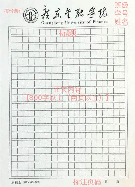 3.每一页都需要标注好页码,按份装订。在第一页右上角用签字笔写上班级学号姓名。