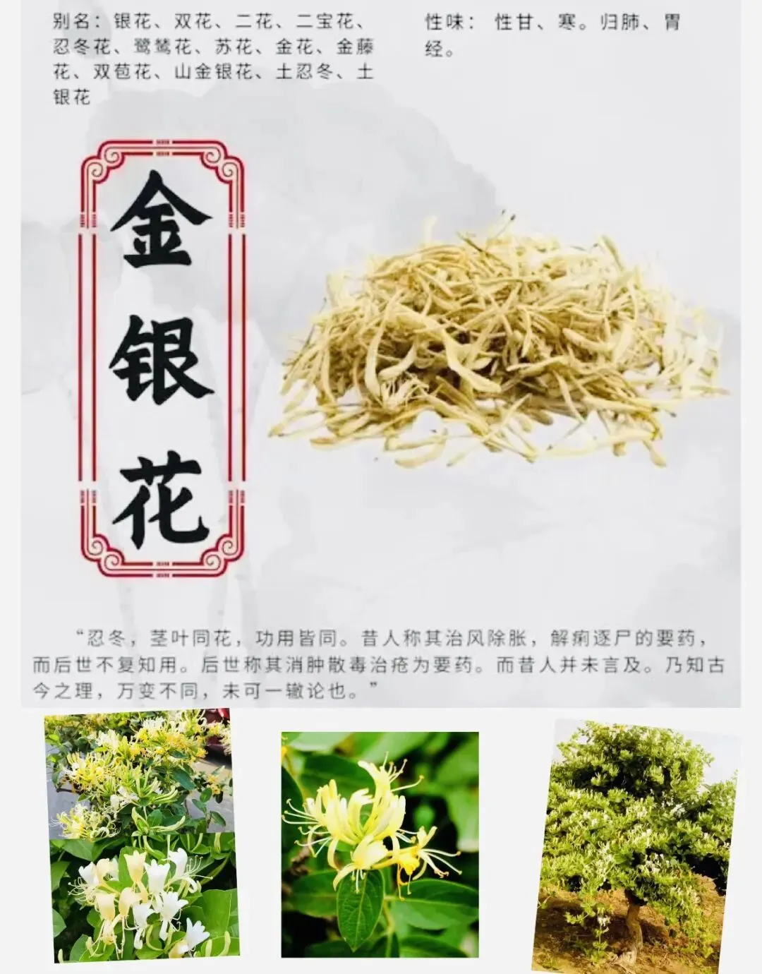 ①金银花(甘寒):疏散风热力优,偏于解表,兼治热毒血痢。