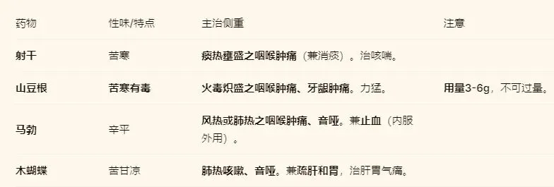 (4)配伍:射干配麻黄 → 宣肺祛痰,治寒痰咳喘(吼中痰鸣,射干麻黄汤)。