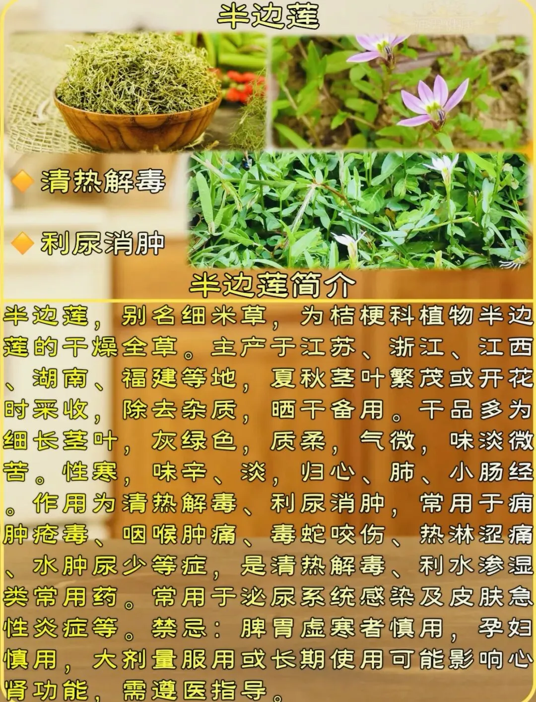 半边莲辛平利水,蛇伤水肿黄疸退。