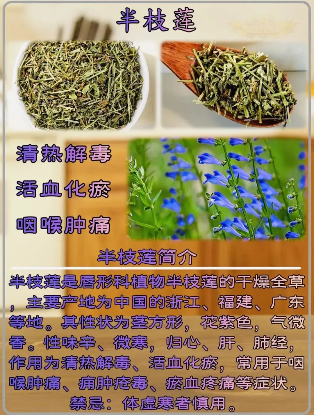 半枝莲苦寒化瘀,跌打癌肿亦可为。