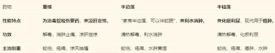 (1)共性:均能清热解毒,利水消肿,治疮痈、蛇伤、水肿。