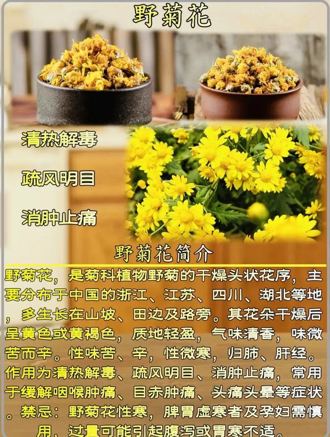 (1)特点:为菊花的一种,清热解毒力强于黄白菊,长于治疗疔疮痈肿。兼能平肝,治头痛眩晕。