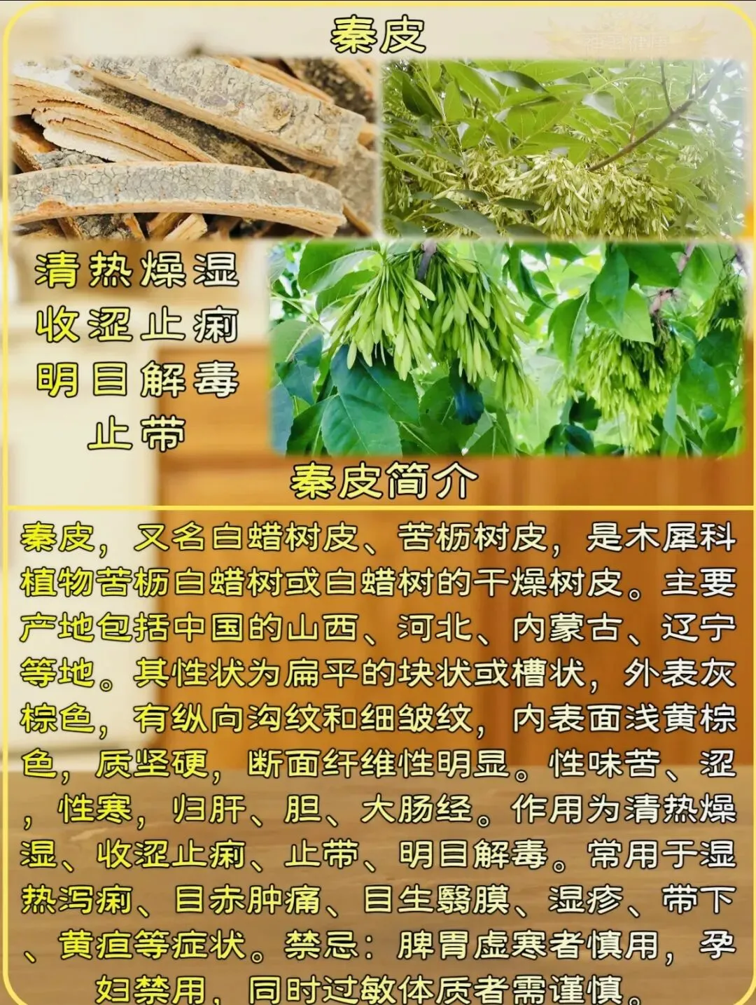 秦皮苦涩寒肝胆,清热燥湿止痢专。