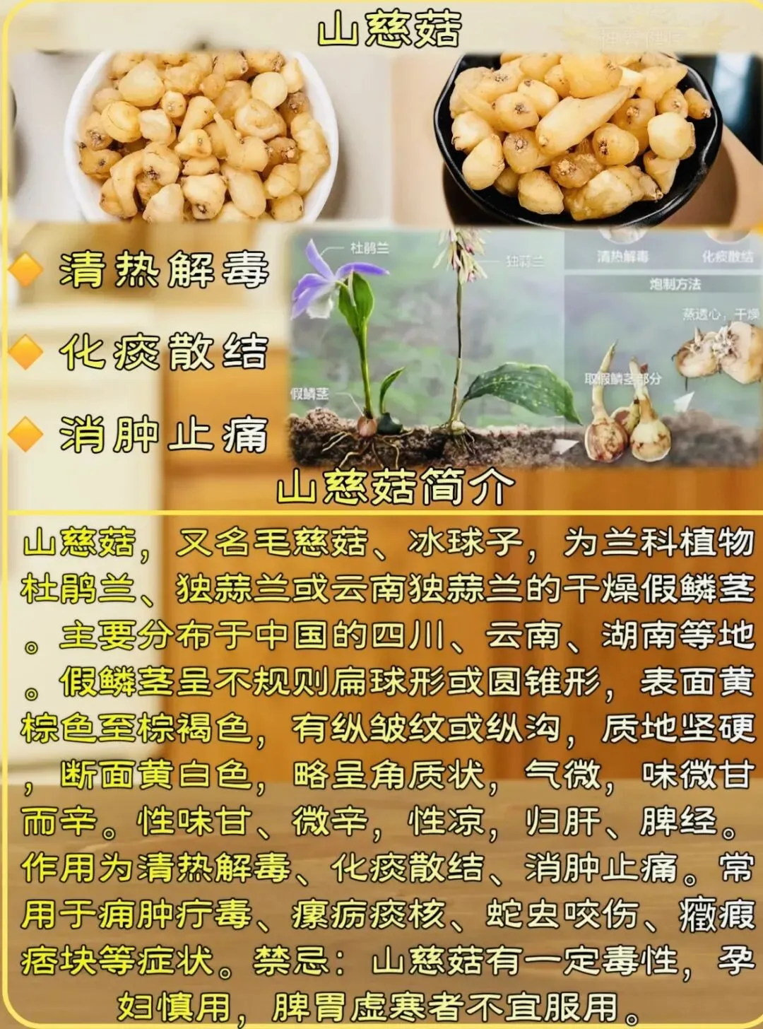 山慈菇凉善散结,痈肿瘰疬痰核灭。
