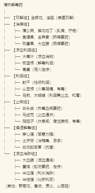 6.联系方剂与病症:结合经典方剂(银翘散、白头翁汤、仙方活命饮)和常见病(扁桃体炎、肺炎、阑尾炎、痢疾、带状疱疹)来理解药物应用,记忆更牢固。