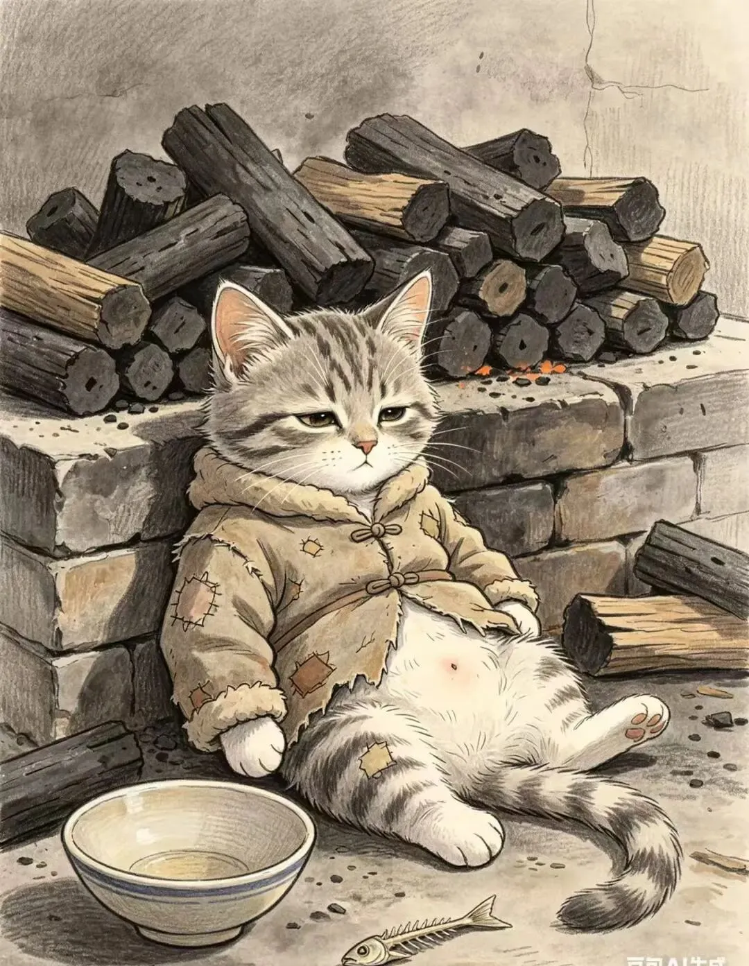 “小猫靠在炭窑边,面前摆着几小堆木炭,眼神疲惫而无奈。它身上穿着一件打满补丁的破旧小棉袄,肚子微微凹陷。旁边放着一个空碗和一根细小的鱼骨。画面用近景,突出小猫清苦的生存状态,色调以灰褐为主。”