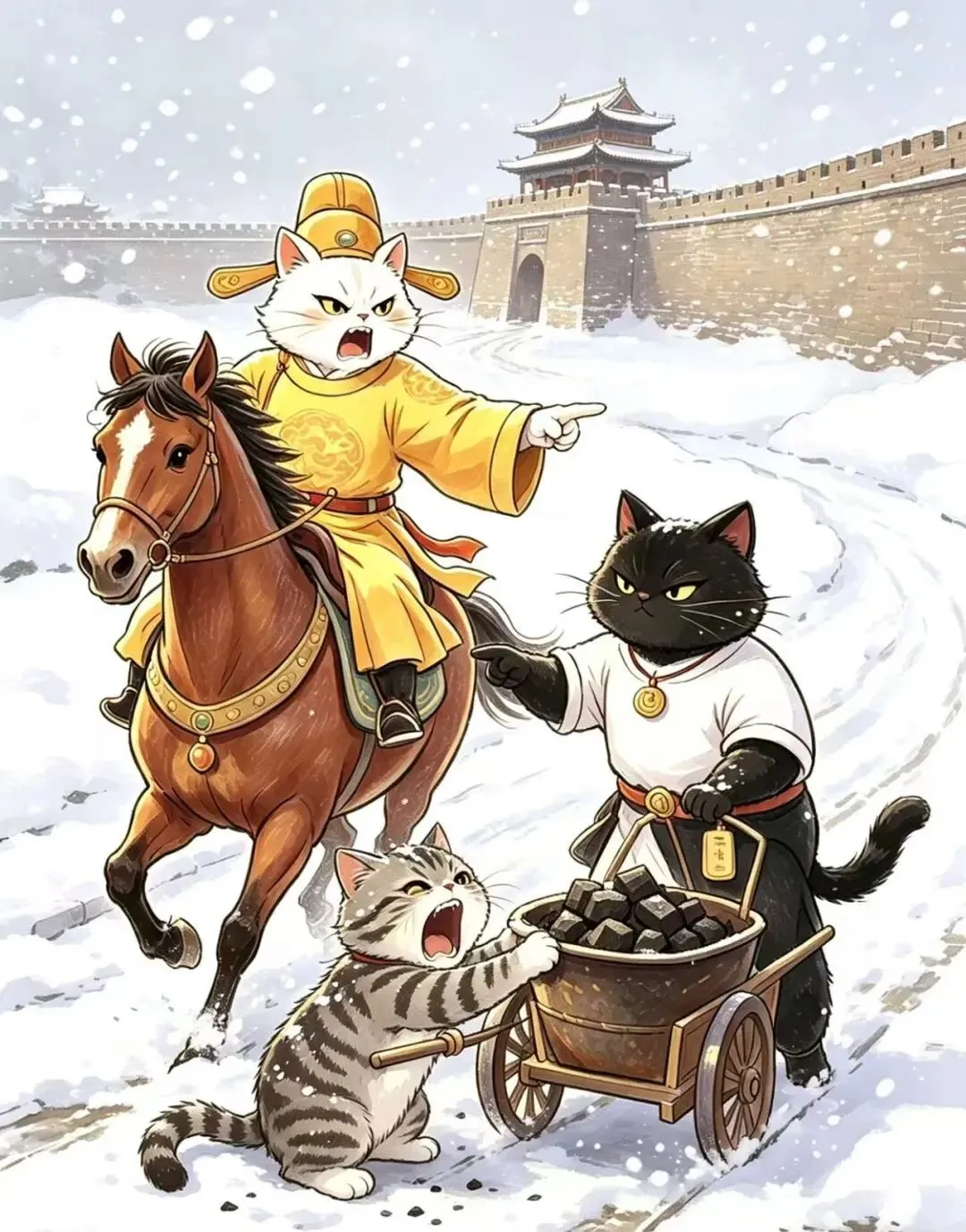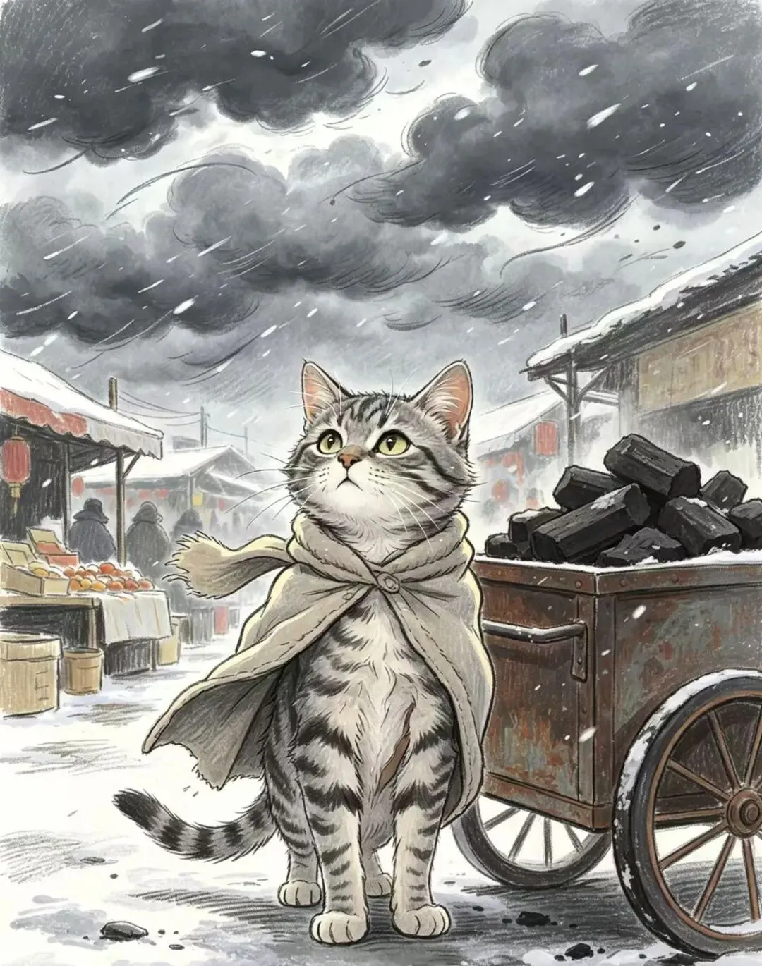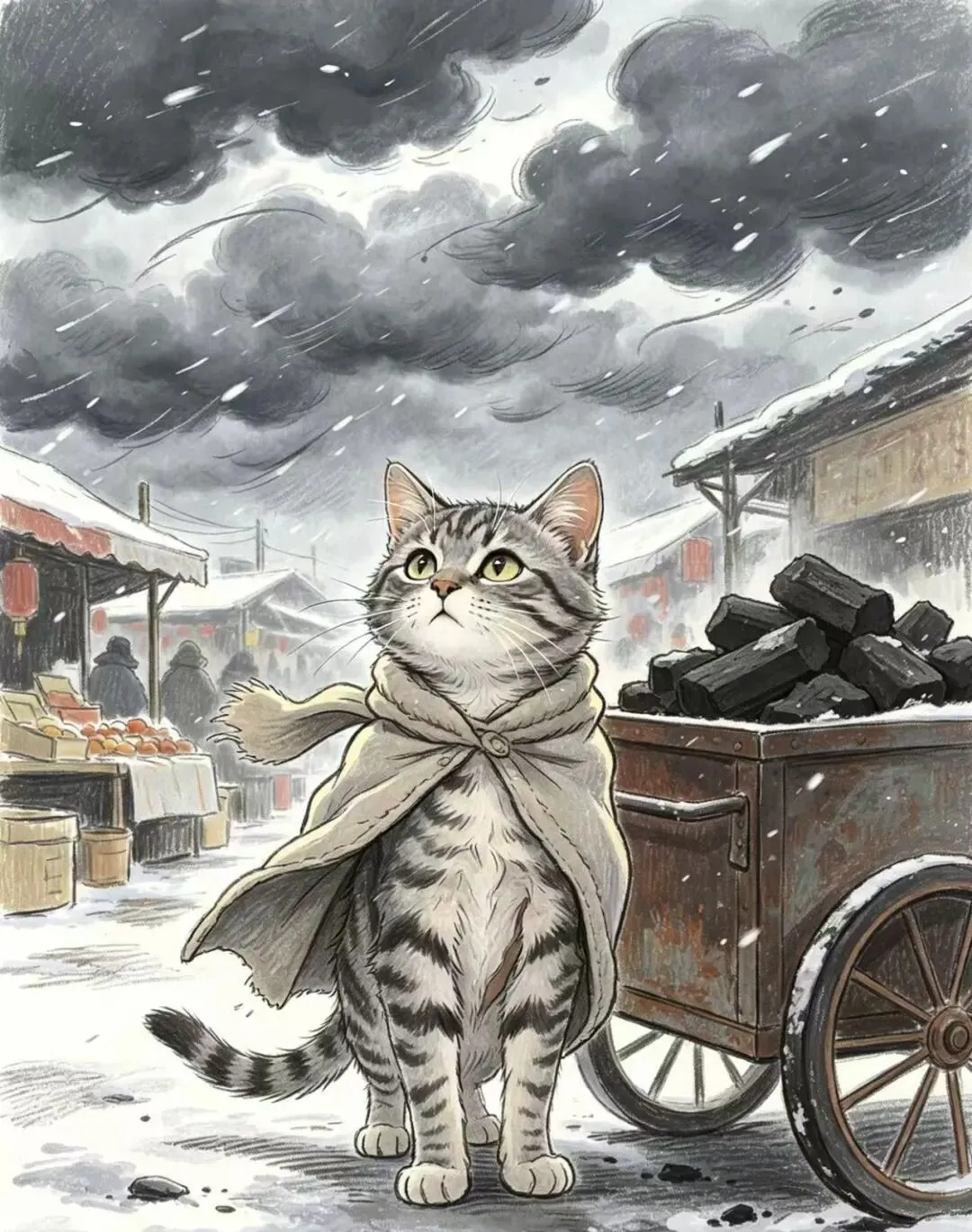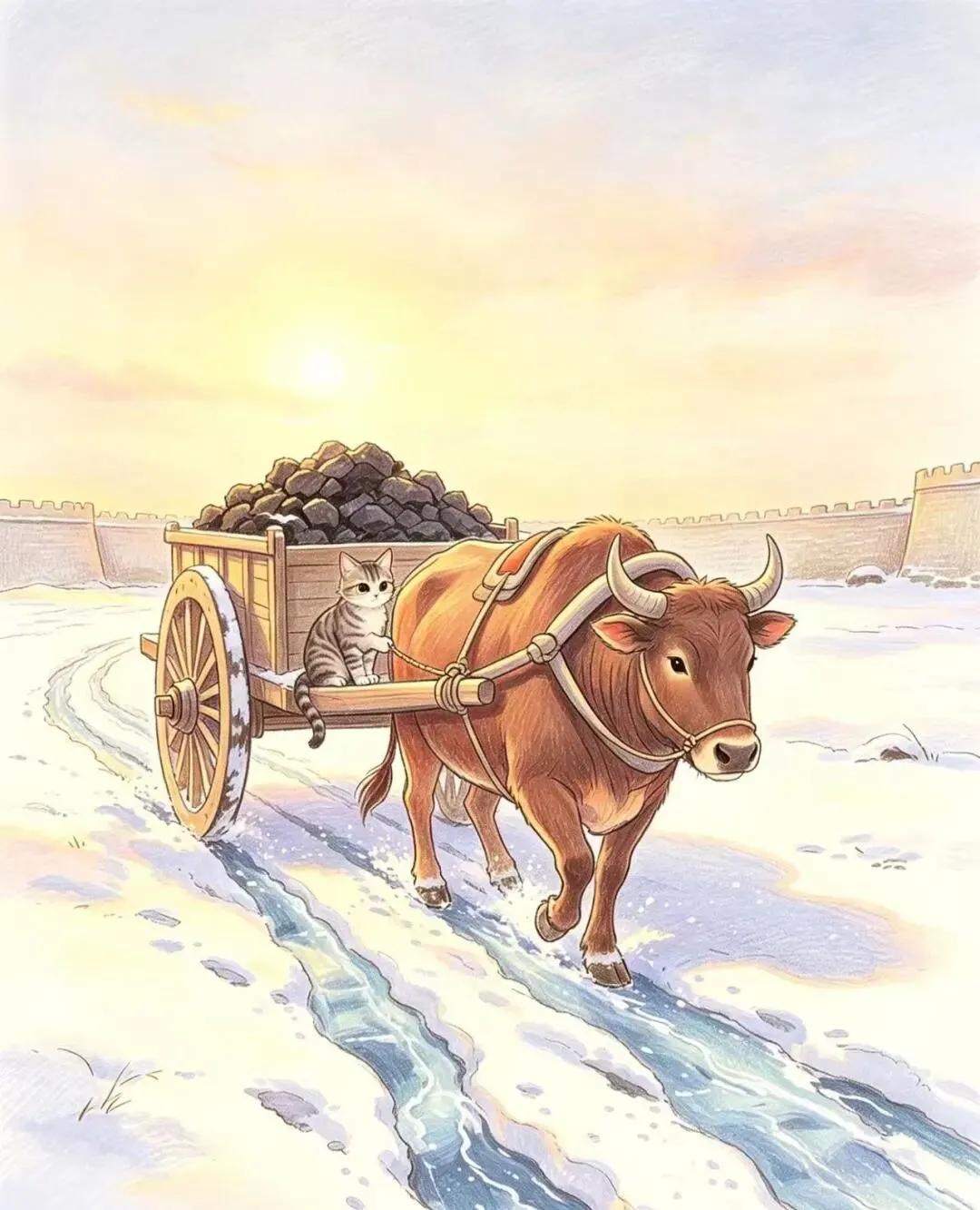 “柿咪咪赶着一头老牛拉的炭车,车轮压在冰雪覆盖的车辙上,雪花飘落,柿咪咪缩着身子,呼出白气。”
