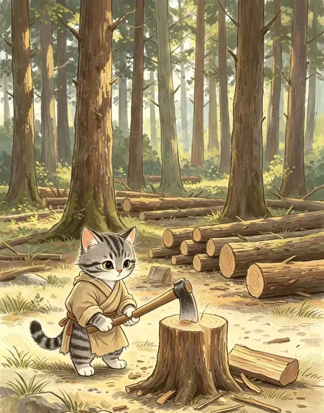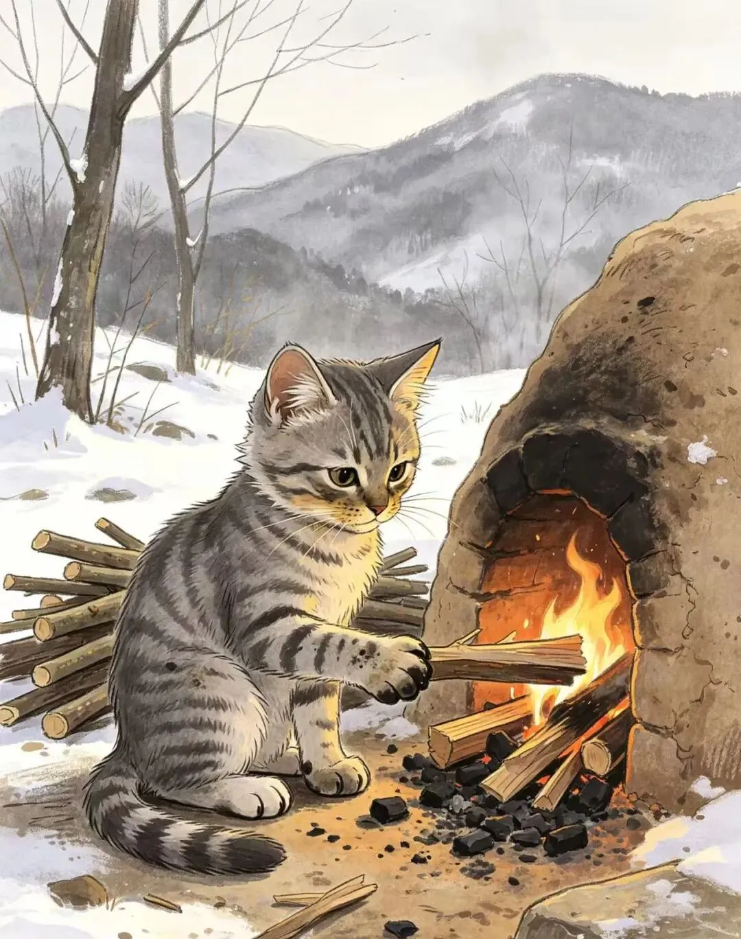 “古风水墨淡彩,柿咪咪穿着粗布麻衣,在南山中砍柴,身后有炭窑冒烟,远山朦胧,雪景初现,温暖与清冷结合”