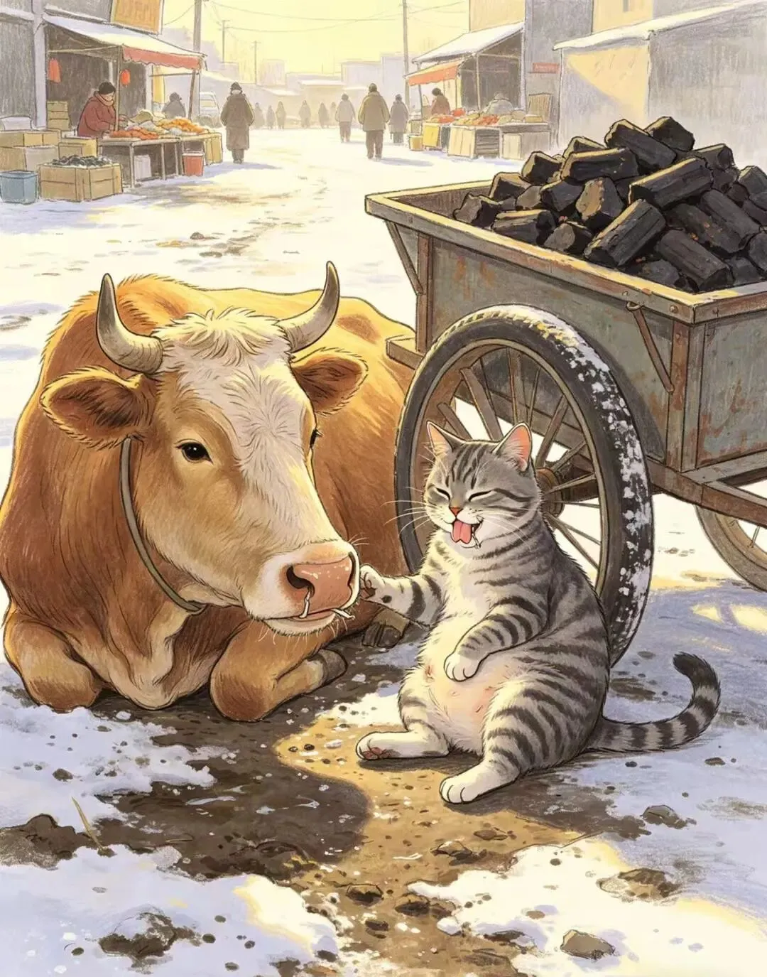 “正午,集市南门外。老牛卧在泥泞的雪地上,鼻孔喘着粗气。小猫也从车上跳下来,靠在车轮旁坐下,前爪搭在饿扁的肚子上,嘴巴微张,舌头舔着干裂的嘴唇。炭车停在一旁,车上的炭堆得满满当当。背景里远处有稀疏的行人和摊位,但无人问津”