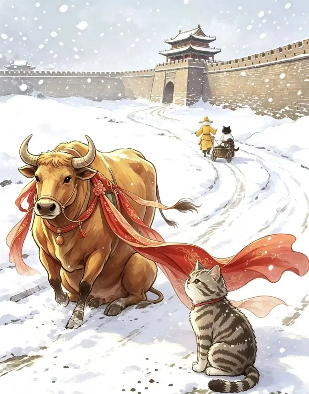 “柿咪咪看着牛头上系着的红绡,伸出爪子轻轻碰了一下,然后缩回来,转身慢慢走远,背影越来越小”