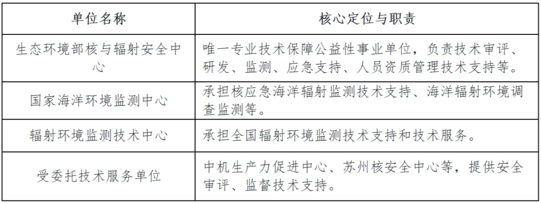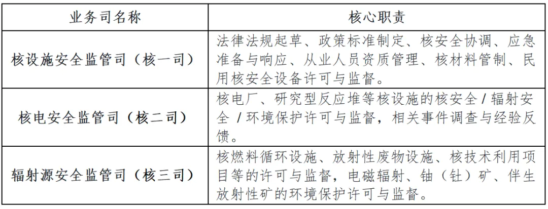 核心职能:履行全国核安全、辐射安全及辐射环境保护工作的统一、独立监督管理职责,拟订政策、规划、标准,负责许可审批、监督检查、应急处理等。