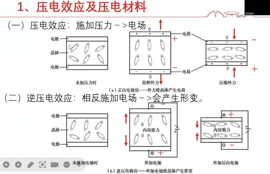 外力作用下:材料发生弹性形变,内部晶胞 / 电畴被拉伸 / 压缩,正负电荷中心发生相对位移,打破了原本的电中性平衡,上、下电极感应出电荷,形成可测量的电场 / 电压。