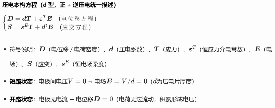 压电效应的行为完全由电边界条件(开路 / 短路)和力边界条件(自由 / 夹持)决定,