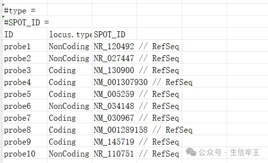 ID locus.type SPOT_ID 1 probe1 NonCoding NR_120492 // RefSeq 2 probe2 NonCoding NR_027447 // RefSeq 3 probe3 Coding NM_130900 // RefSeq 4 probe4 Coding NM_001307930 // RefSeq 5 probe5 Coding NM_005259 // RefSeq 6 probe6 NonCoding NR_034148 // RefSeq 7 probe7 Coding NM_030967 // RefSeq 8 probe8 Coding NM_001289158 // RefSeq 9 probe9 Coding NM_145719 // RefSeq 10 probe10 NonCoding NR_110751 // RefSeq示例四:ex4.tsv
