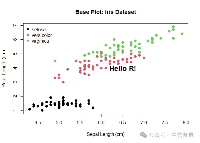 p0 <- plot( x = iris$Sepal.Length, y = iris$Petal.Length, col = iris$Species, # 按物种着色 pch = 16, # 实心圆点 cex = 1.2, # 点大小 xlab = "Sepal Length (cm)", # x轴标签 ylab = "Petal Length (cm)", # y轴标签 main = "Base Plot: Iris Dataset"# 标题 )# 添加图例 legend("topleft", legend = levels(iris$Species), col = 1:3, pch = 16, bty = "n" )# 添加文本标注 text(6.5, 4, labels = "Hello R!", cex = 1.5, font = 2) dev.off()