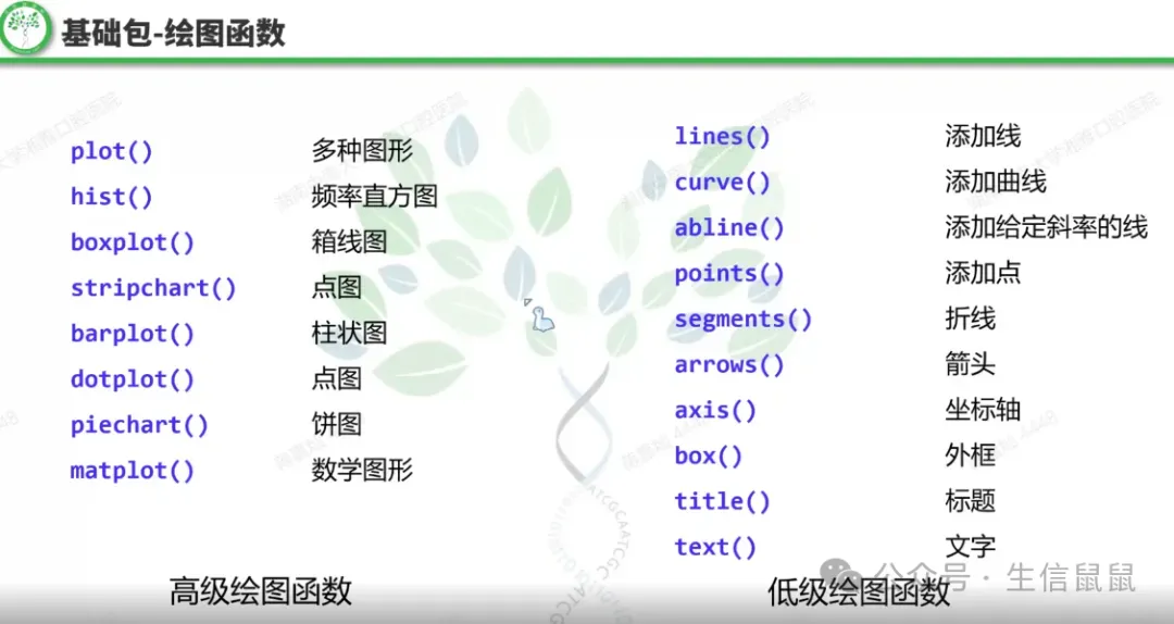 我们可以看到,基础包的绘图语法相对直接,但在复杂图形的定制化方面可能需要更多的代码和调整。 而基础包又分为高级函数和低级函数,低级函数的功能依赖高级函数而存在: