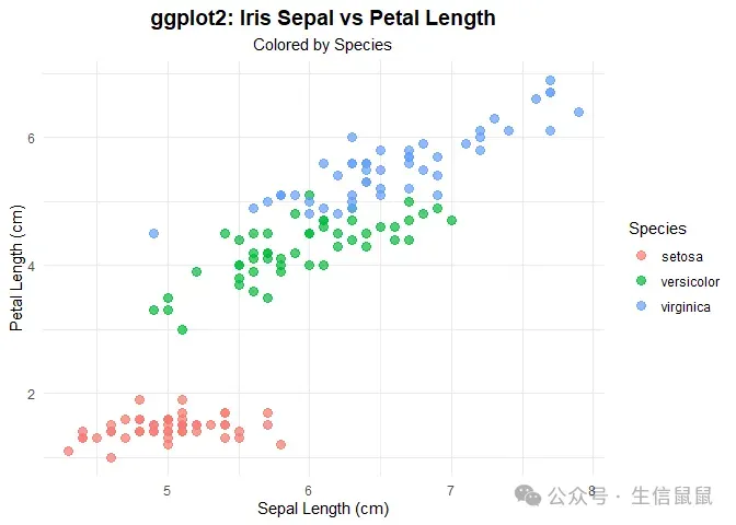 library(ggplot2)# 基础散点图ggplot(data = iris, aes(x = Sepal.Length, y = Petal.Length, color = Species)) + geom_point(size = 3, alpha = 0.7) + # 点的大小和透明度 labs( title = "ggplot2: Iris Sepal vs Petal Length", subtitle = "Colored by Species", x = "Sepal Length (cm)", y = "Petal Length (cm)", color = "Species" ) + theme_minimal() + # 简洁主题 theme( plot.title = element_text(hjust = 0.5, size = 14, face = "bold"), plot.subtitle = element_text(hjust = 0.5) )