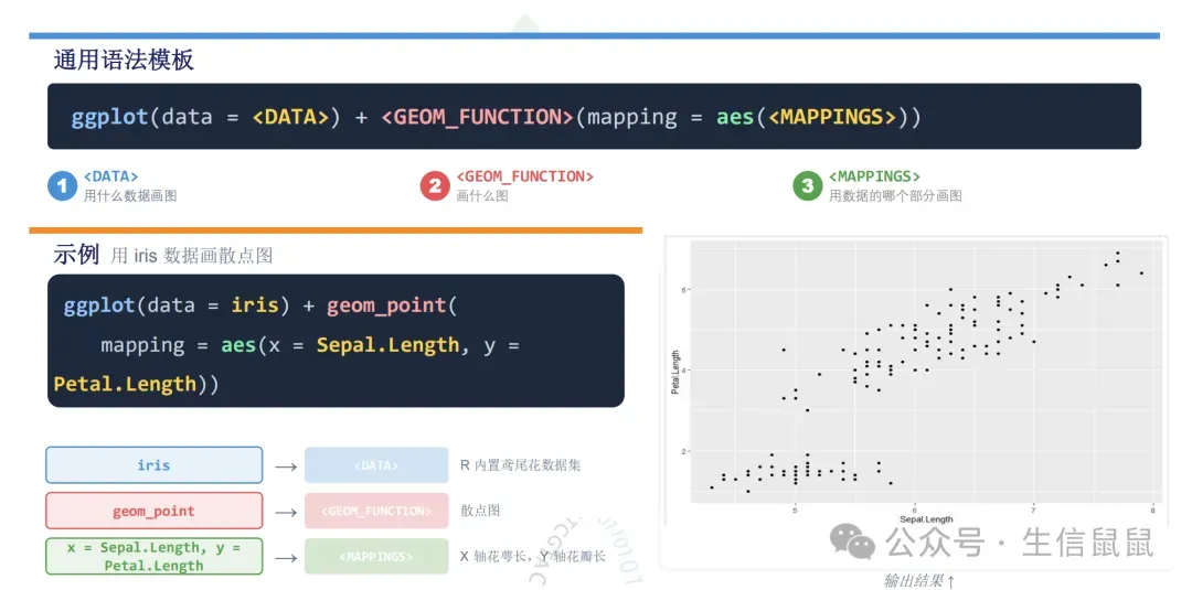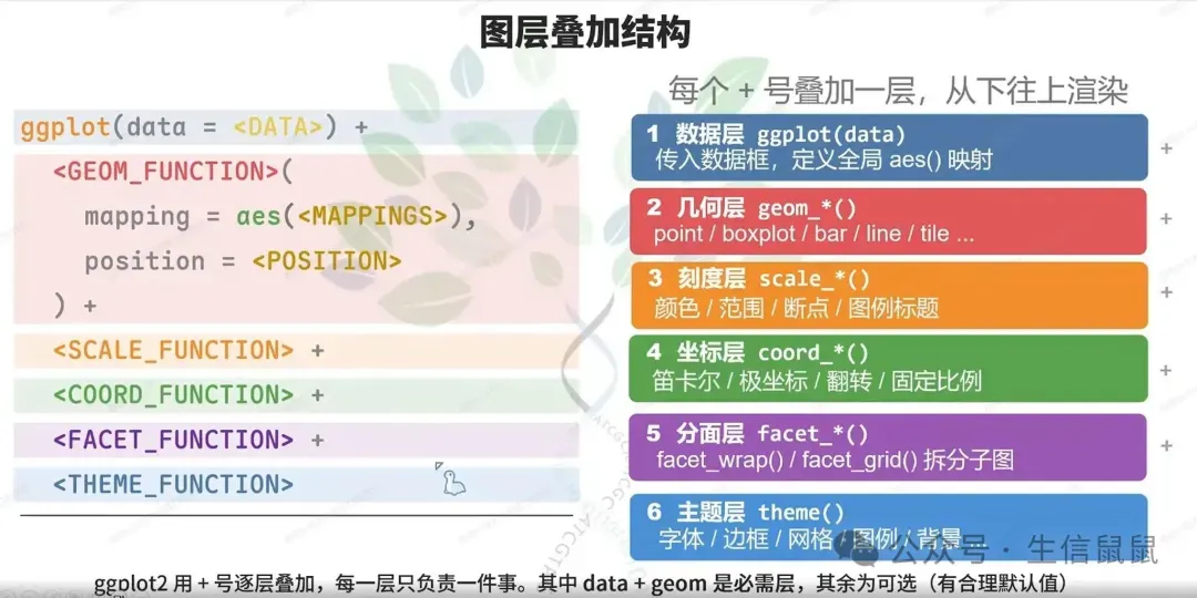 ggplot2的语法有点像一层一层盖房子,以下是一个通用语法规则: