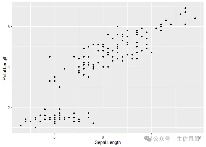 library(ggplot2) ggplot(data = iris) + geom_point(mapping = aes(x = Sepal.Length, y = Petal.Length))
