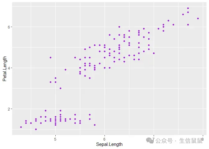 ggplot(data = iris) + geom_point(mapping = aes(x = Sepal.Length, y = Petal.Length), color = "purple") #我设置成紫色