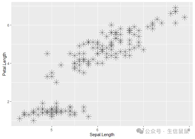ggplot(data = iris) + geom_point( mapping = aes(x = Sepal.Length, y = Petal.Length), size = 5, # 点的大小5mm alpha = 0.5, # 透明度 50% shape = 8 ) # 点的形状