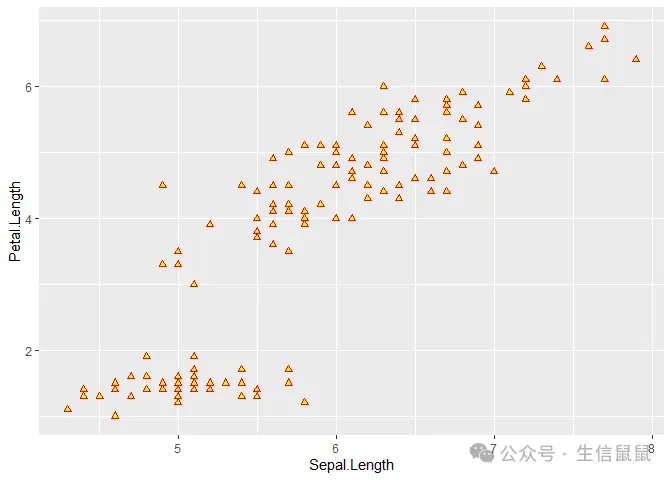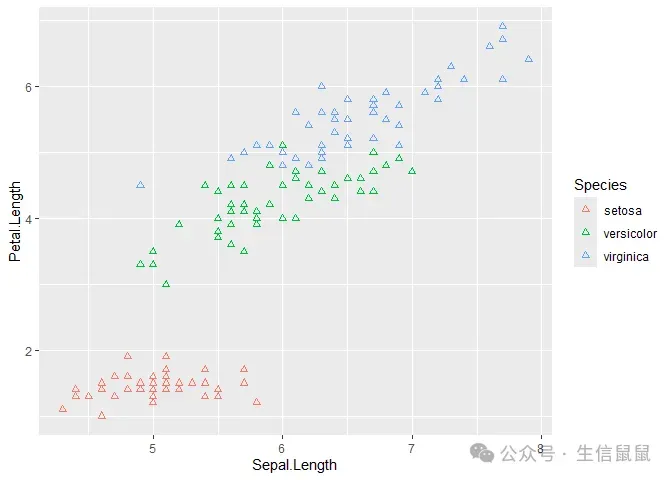 ggplot(data = iris) + geom_point( mapping = aes(x = Sepal.Length, y = Petal.Length, color = Species), shape = 17 ) #17号,实心的例子